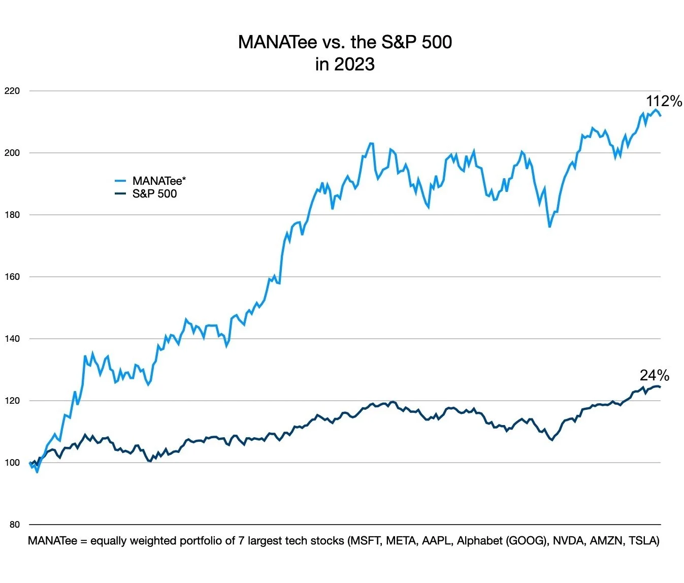 The seven big tech stocks, the MANATees*, were the engine behind stock market performance in 2023, generating a whopping annual return of 112% on an equally weighted basis. This compares to a 24% return for the the S&P 500.