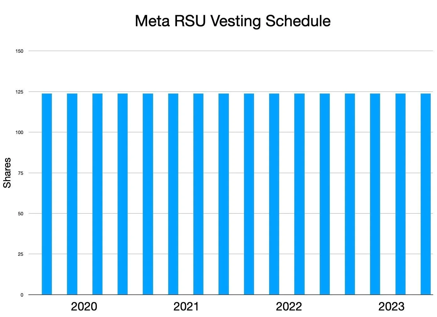 Let’s imagine an initial RSU package of $400,000 set at the beginning of 2020 when one share of Meta (then Facebook) was priced at $202. The grant would amount to $400,000 / $202 = 1,981 RSUs, which would vest every quarter over 4 years at a rate of 124 RSUs per quarter (1,981 / (4 *4):