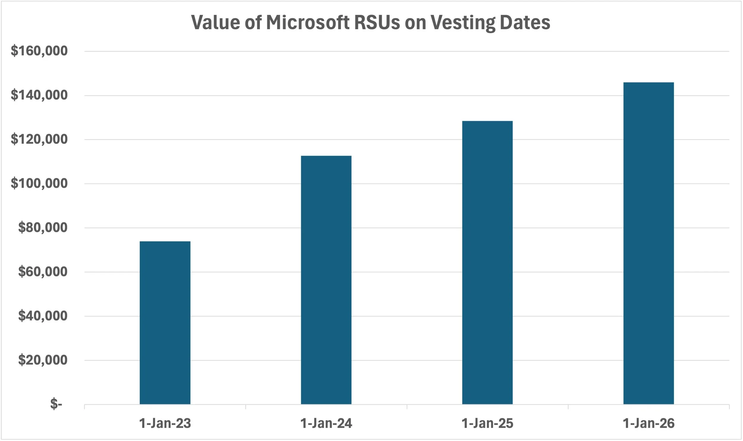 Ideally, Microsoft’s stock price will rise over the vesting period, so that the dollar value of the shares received rises over time (even though the number of shares does not change). Here’s how a $400,000 RSU grant made at the beginning of 2022 would have vested in dollar terms over the following 4 years: